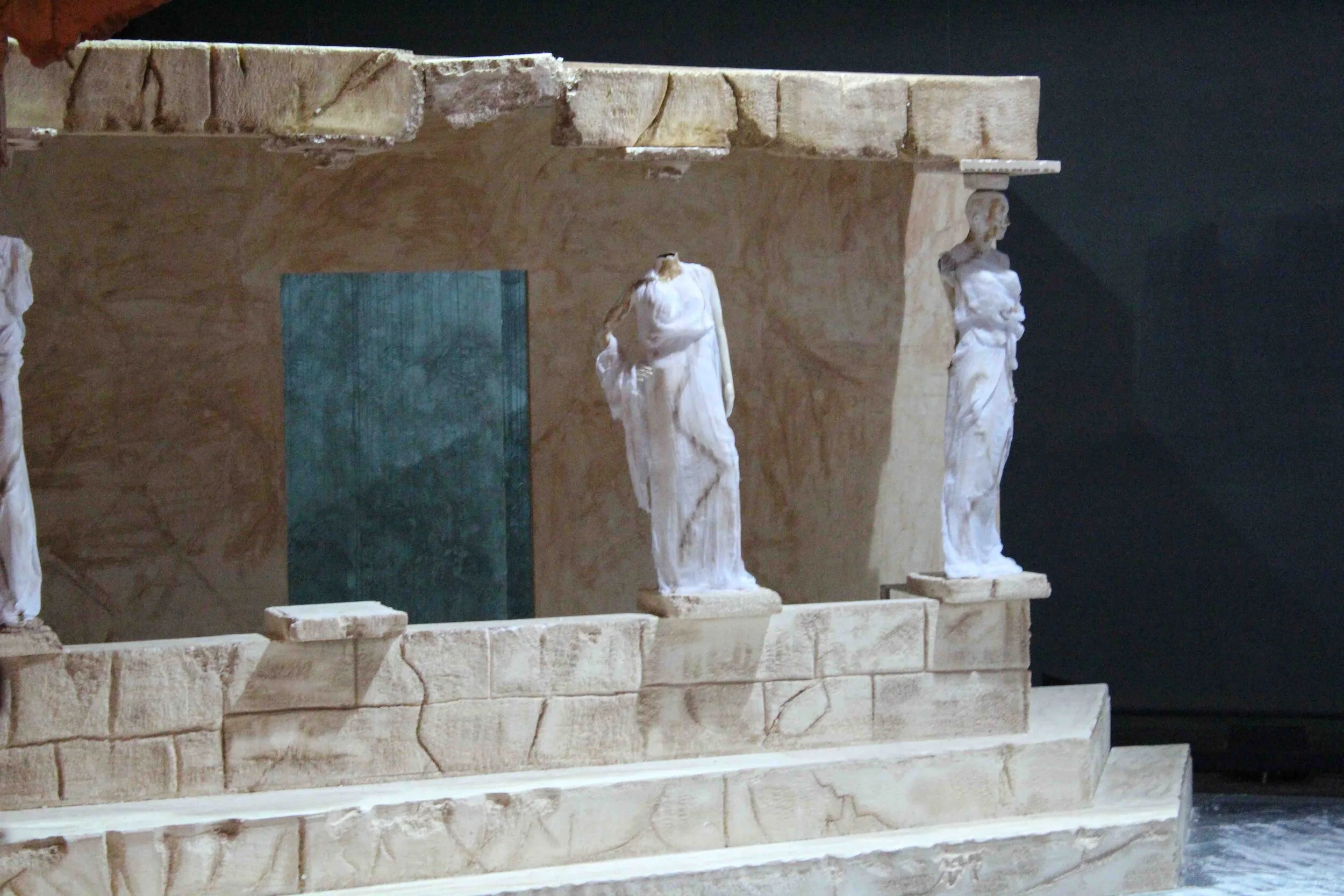 As with many theater storage areas, sometimes there is a collection of strange things. AUC storage had a large collection of mannequins. These were taken, partially disassembled, draped in muslin and painted with a white paint and glue mixture to create the proper sculptured effect. The distressed rock effect was achived by facing the wood structure with foam and then carving it to look worn and broken. This marble-like paint treatment was common throughout the set. The majority of the set was painted in this way by a single contract student who didn’t realize that she had a knack for painting. She started with the technique on these steps and within several days was painting the highest columns 6 meters in the air while in a GenieLift.